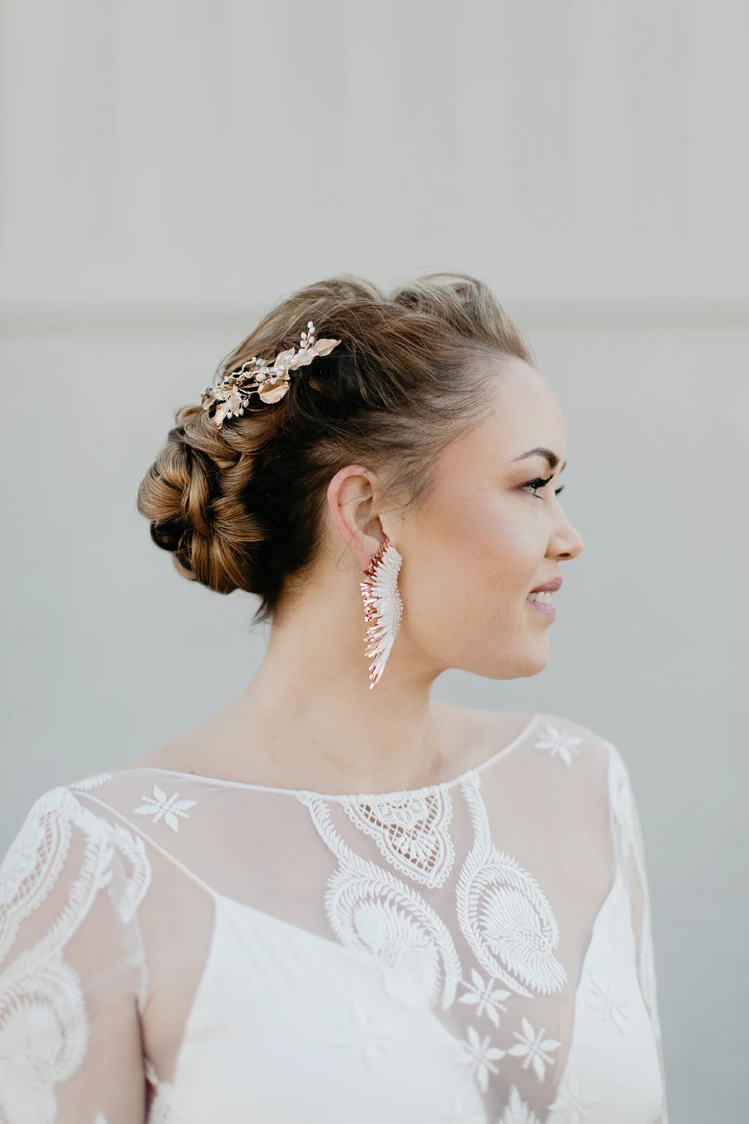 A few amazing details to note about the wedding in this publication. Emily & Chris had an absolutely divine Pinterest perfect wedding. For her style she wanted to balance boho glamour & unique details to reflect her personality. We did a low updo with loads of twists & loops taking a standard low updo & transforming it into a work of modern art. Everything about their wedding was a beautiful blend that shows you can infuse personality seamlessly without sacrificing tradition or aesthetic.